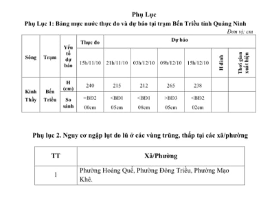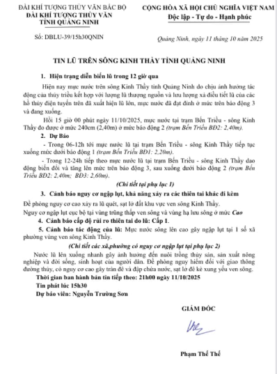 Đến 15h00 ngày 11/10/2025, mực nước tại trạm Bến Triều (sông Kinh Thầy) đo được ở mức 2,40m, tương đương báo động 2. Trước đó, mực nước đã đạt đỉnh trên báo động 3 và hiện đang có xu hướng giảm dần.